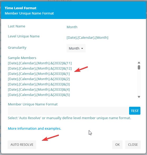 Numbers in the member's unique name should be replaced by certain date parts (Year, Semester, Quarter, Month, Week, Day), that would describe to the application which date parts are needed to construct a member's unique name.