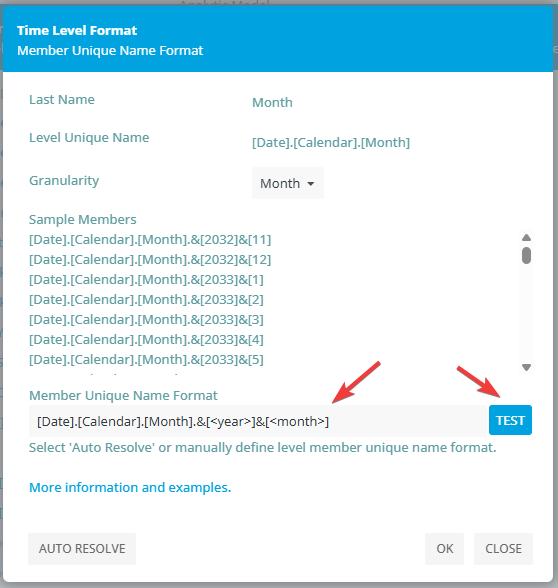 Member Unique Name Format: [Date].[Calendar].[Month].&[<Year>]&[<Month>]